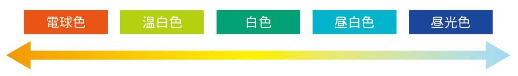 「電球色」はオレンジっぽく、「昼光色」は青白っぽい色になります。